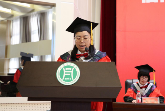 仪式第三项:教师代表市场营销教研室副主任袁俊老师发言。她为毕业生们送上临别赠言:一要保持对生活的热爱和信心,学会体验和享受困难。二要保持开放的心态,养成终身学习的能力。三是要坚守住做人的原则和底线,做一个品行端正的人。最后袁俊老师代表工商管理学院全体老师祝2023届毕业生们毕业快乐,在以后的学习工作生活中熠熠生辉。