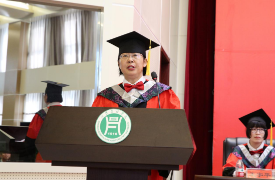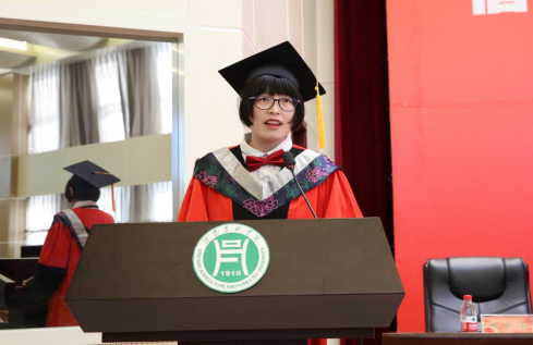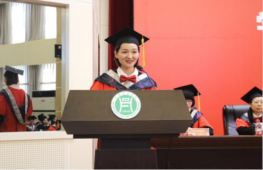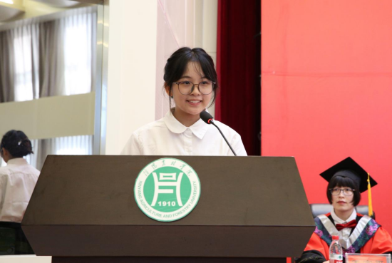 仪式第五项:在校生代表冯璐冉发言。何其有幸能够代表工商管理学院在校生们在这隆重的毕业典礼上,向即将离开母校的师哥师姐们送上我们最美好的祝愿。祝愿你们,以母校为起点,走出校门、走向世界,邂逅更优秀的自己,闯荡更精彩的人生。祝愿你们,在杨帆奋进的同时,能够保持初心、坚定信念,以盎然的兴致和无畏的勇气与世界交手。祝愿你们,永葆童心,快乐至真,热爱自己,热爱生活。