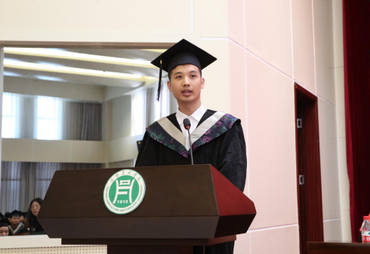 仪式第四项:毕业生学生代表张世豪发言。一路走来,母校承担了我们的欢笑与泪水,磨炼了我们的意志与担当,学院的各位老师们就像我们人生路上的光,在黑暗中给我们希望,在逆境中给我们力量。四年的旅途即将结束,但人生之路才刚刚开始。莫听穿林打叶声,何妨吟啸且徐行,祝愿大家风雨无阻定风波,顶峰相见!