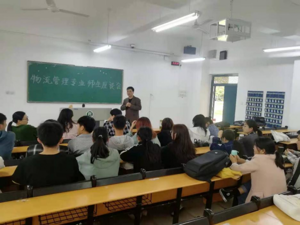 4月28日下午4:30工商管理学院物流管理教研室主任尚扬、副主任梅宝林、专任教师方海云、郭俊玲、陈国宏等与物流管理专业各班学生代表在二教101召开师生座谈会。
