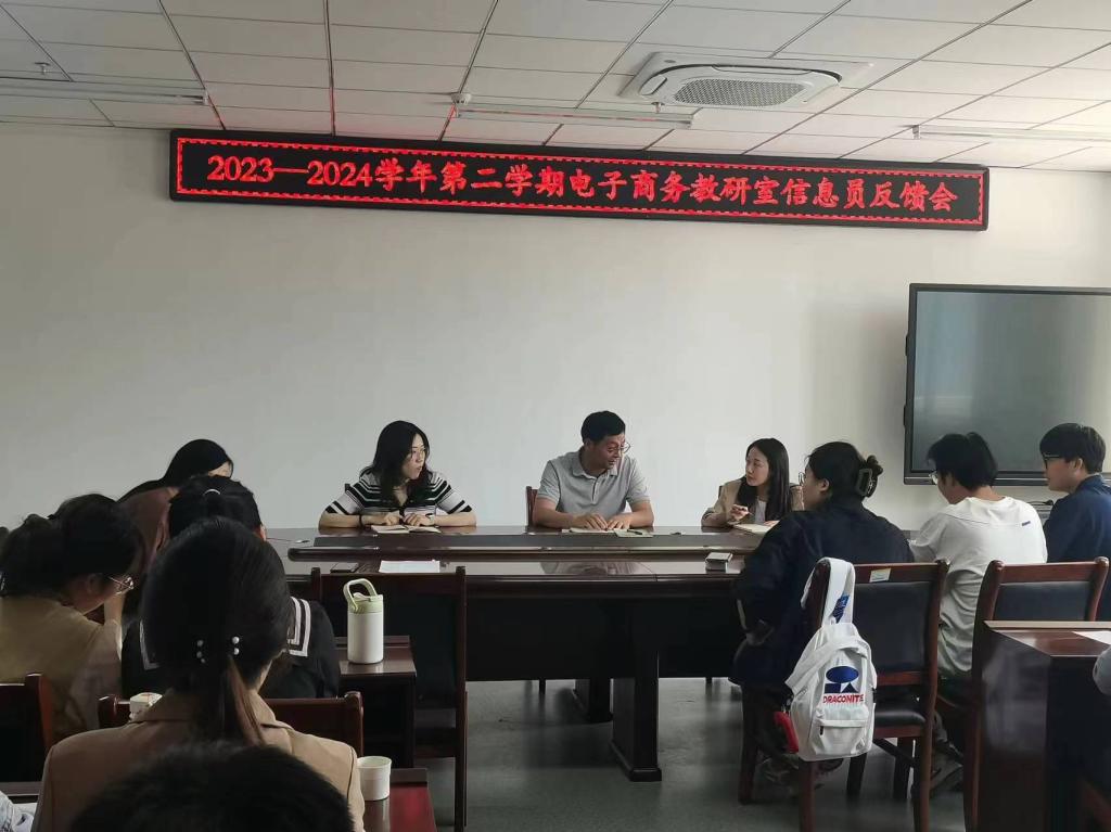 为加强师生之间的沟通交流,深化教育改革,进一步提高教学质量,电子商务教研室于4月23日召开2023-2024学年第二学期师生座谈会,电子商务教研室王振江教授、孟益臣老师、陈晓婧老师和电子商务专业部分学生代表参加了座谈会。