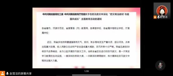活动开始,赵莹洁老师首先向同学们传达了《关于在防汛救灾中深化“把灾难当教材 与祖国共成长”主题教育活动的通知》文件内容与精神,聚焦“榜样、感恩、奉献、爱国”等关键词,讲述疫情期间“逆行者”的感人故事和我院涌现出的一大批勇担重任、积极参加各类疫情防控工作的青年学生,将疫情、灾难变为一本生动的“活教材”,引导学生要把灾难当教材、把困难当磨砺,共同完成生命教育、科学教育、信念教育和道德教育。同学们纷纷表示,要以实际行动为抗击疫情贡献力量,用自己的方式发光发热,在这场特殊的青春战“疫”实践课中自觉践行社会主义核心价值观,有所学、有所悟、有担当、有成长。
