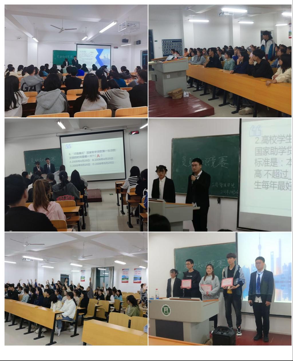 比赛时,参赛选手积极答题,学生观众积极互动,现场氛围紧张热烈。从选手表现可以看出,参赛选手都为此次比赛做了充分的准备,同学们对资助政策的熟悉程度很高。经过几轮角逐,比赛评选出了一二三等奖和参与奖,并给现场观众发放小礼品,鼓励大家更多的学习了解国家资助政策知识。