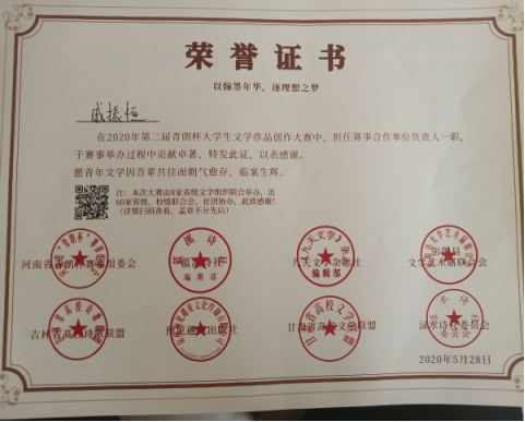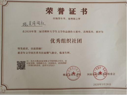 2020年3-5月,由河南省“青朗杯”赛事委员会所主办的第二届“青朗杯”大学生文学作品创作大赛圆满结束。我院揽星诗词社成员积极参与活动,并在大赛中获奖。同时,社团也荣获优秀组织奖。