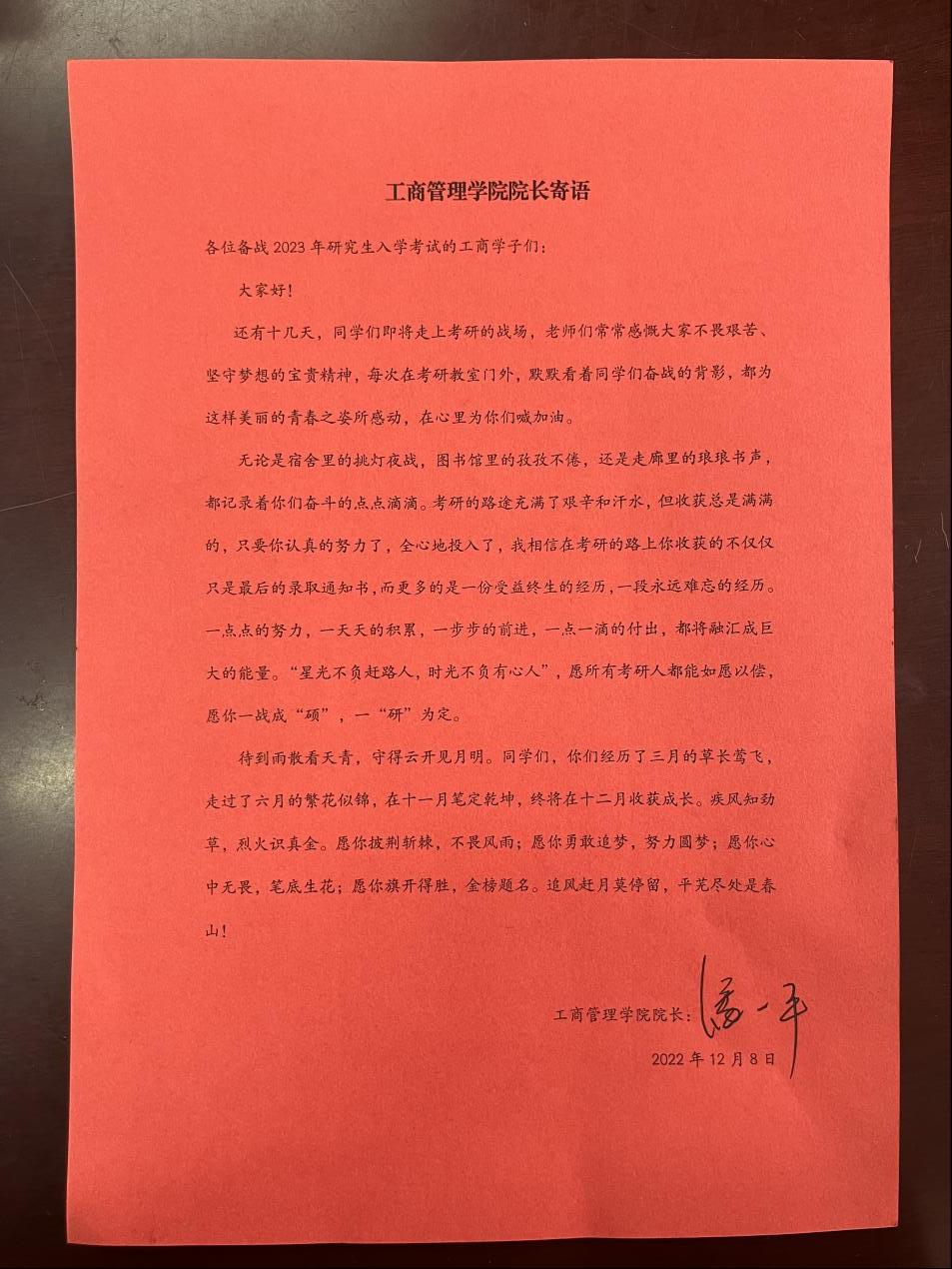 院领导不仅为学生送上了暖心的祝福,还准备了丰厚的考研福袋,预祝学生们旗开得胜。打开福袋,⼀张院长寄语映入眼帘,字里行间都透露着对考研学子的关怀祝福,亲切的寄语温暖了考研⼈的心。美味的零食温暖了考研⼈的胃,寓意着旗开得胜的脐橙,牛气冲天的旺仔牛奶,势在必得的士力架,榜上有名的棒棒糖,加油打气的奥利奥,福袋里的每⼀份礼物都是来自学院最真挚的爱与祝愿。