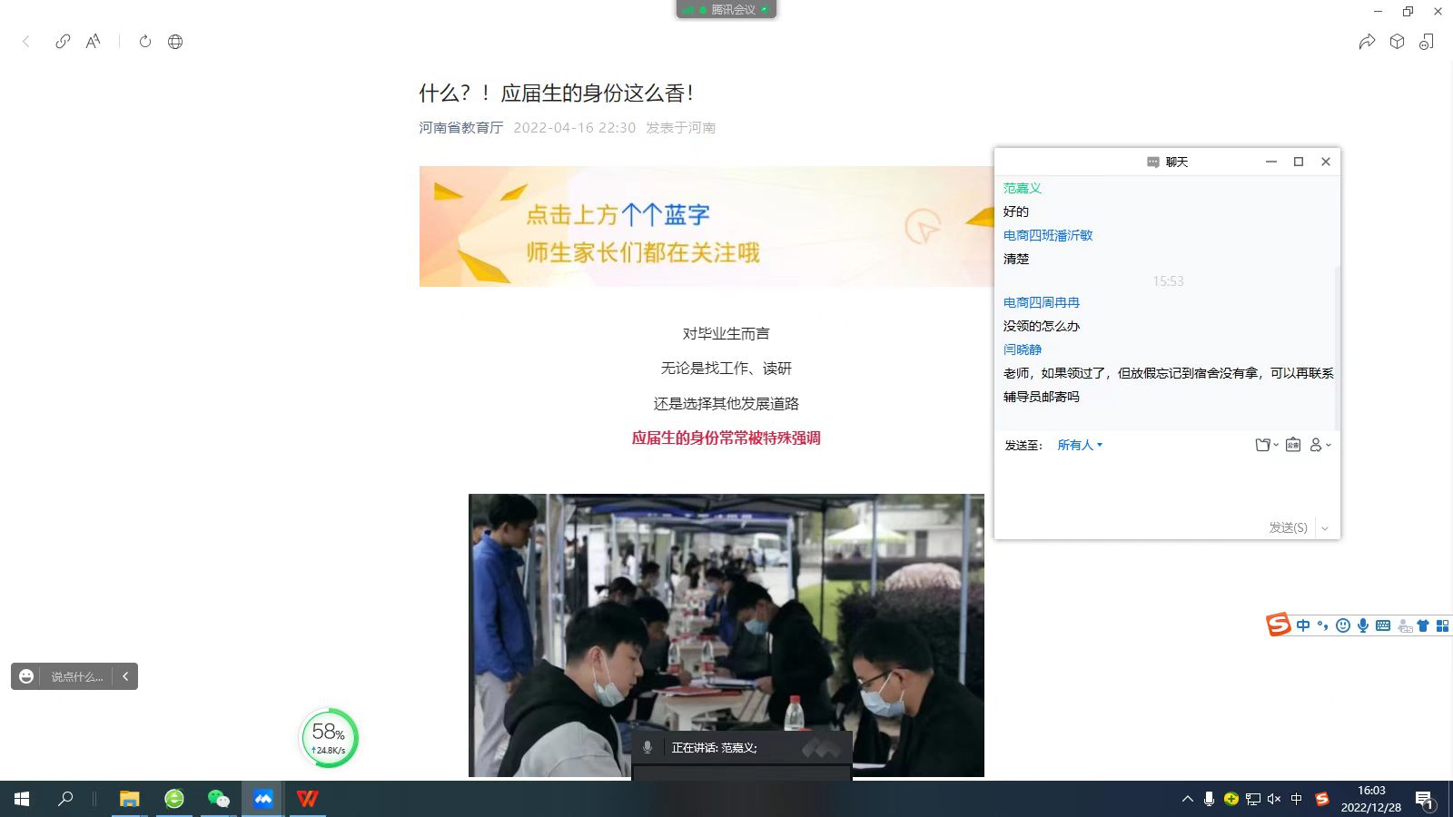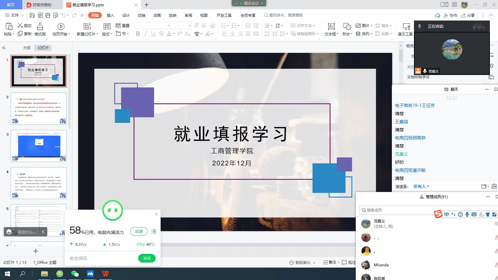 为帮助毕业生熟悉就业政策,提高就业意识,2022年12月28日,工商管理学院就业专员范嘉义线上为2023届毕业生召开了就业指导讲座。