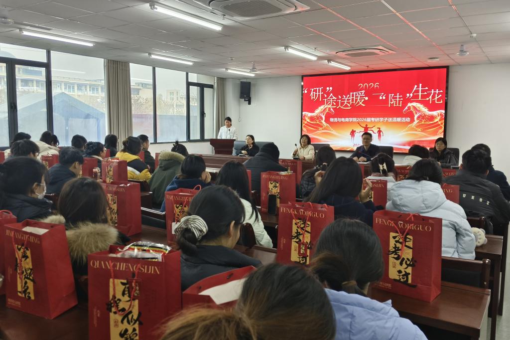 为鼓舞考研学子士气,缓解备考压力,传递学院温暖关怀,12月2日,物流与电商学院于双创208会议室举办“‘研’途送暖,一‘陆’生花”考研送温暖活动。党委书记吴磊、院长潘一平及学院班子成员、教师代表、2026届考研学子共同参加。
