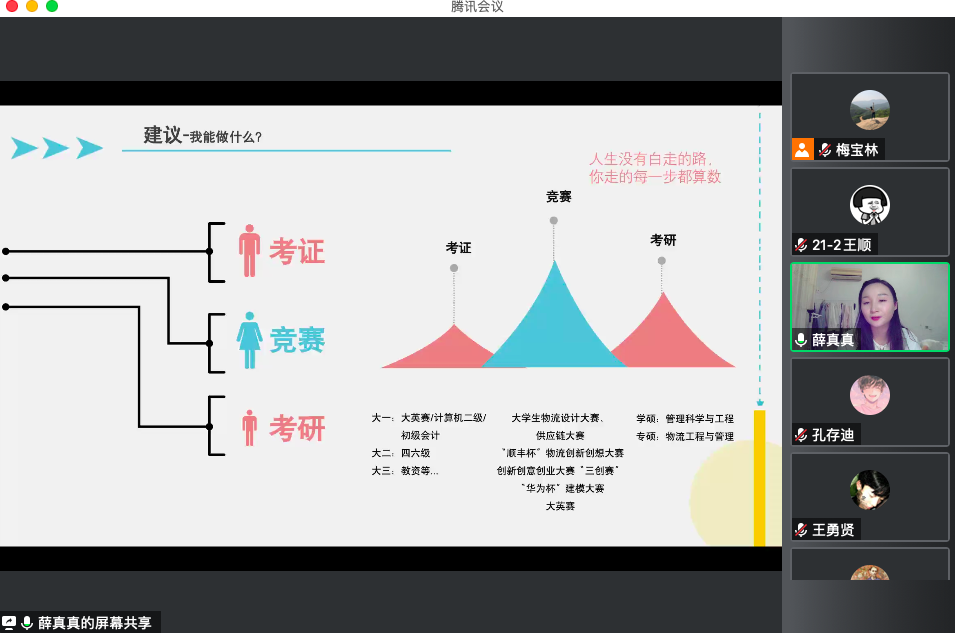 2022年11月7日下午5点,工商管理学院物流管理教研室在腾讯会议举办了题为“大学生学业生涯规划”主题讲座。本次讲座由薛真真主讲,物流管理专业2021级和2022级全体学生参加。
