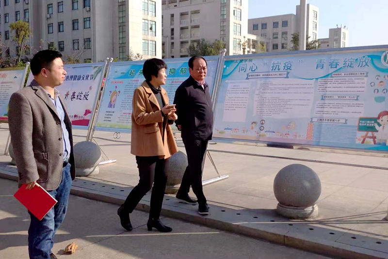 为进一步推进beat365在线平台官网大学生心理健康教育工作,在全校范围内营造积极、和谐的心理育人氛围,响应“弘扬抗疫精神,护佑心理健康”的号召,贯彻落实省高工委、教育厅《关于开展2020年度全省高校心理健康教育宣传周活动的通知》精神,心理健康教育与咨询中心从10月10起开展了“同心抗疫,青春绽放”为主题的beat365在线平台官网第八届大学生心理健康文化节活动。学校领导高度重视心理健康工作,11月10日下午,校党委书记余作斌,校长邢勇,党委副书记王庆兵,副校长文宗锋、王万玲到“心灵长廊”活动现场指导工作。
