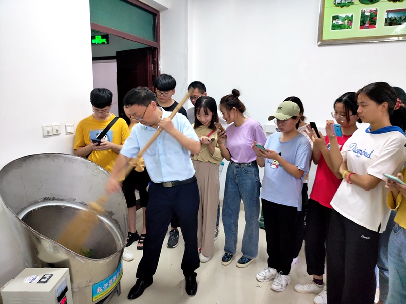 周祖宏和肖兴亮向同学们示范指导了信阳毛尖独特的炒制工艺生锅和熟锅炒制技艺,并分享了自己制茶几十年来的实践经验,杀青要到位,赶条要均匀,理条靠手感,火候是关键。郭桂义教授通过详细的讲解,使同学们从每一步制作工艺中了解了信阳毛尖细圆紧直品质特点的形成。