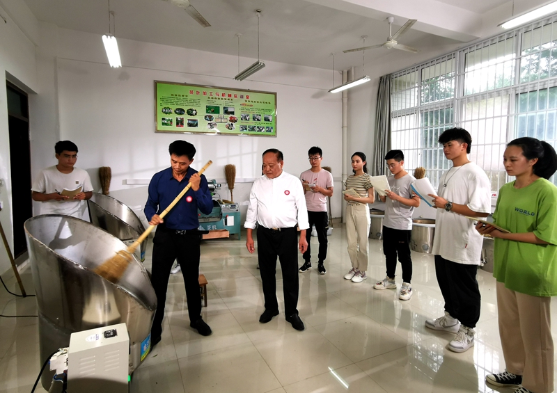 9月10日-11日,茶学院邀请国家级非物质文化遗产代表性项目信阳毛尖制作技艺国家级传承人周祖宏先生和信阳市级传承人肖兴亮示范指导学生《制茶学》教学实习——信阳毛尖茶制作。茶学院院长、二级教授、全国技术能手、国家级技能大师工作室领办人郭桂义,《制茶学》专业教师、副院长陈义副教授和王子浩老师等与2位传承人共同指导学生传统信阳毛尖手工炒制。副校长黄松、茶学院党总支书记袁丁老师、副院长孙慕芳副教授等进行了观摩督导。