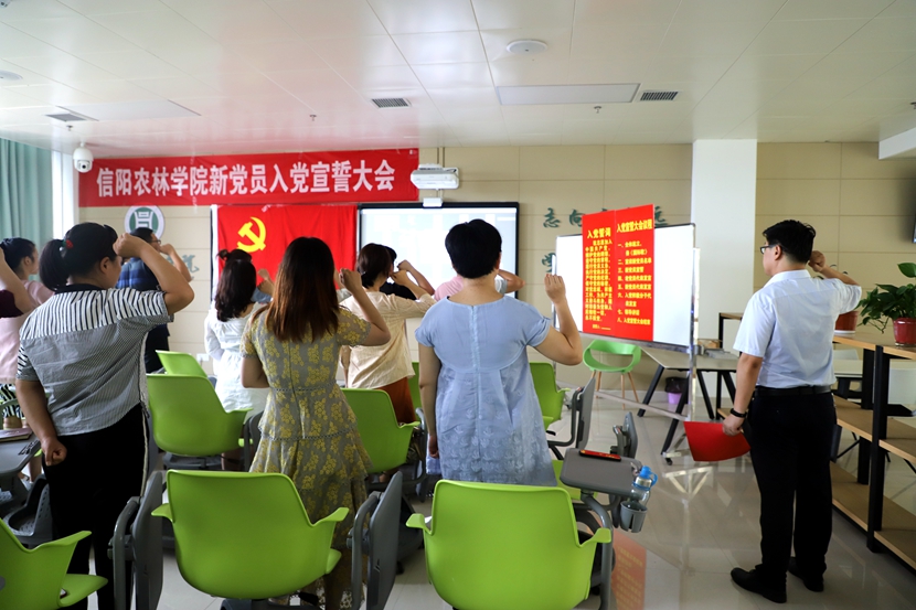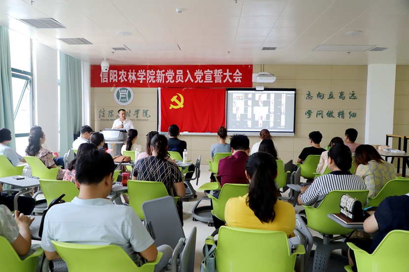 6月30日下午,beat365在线平台官网2020年春夏学期新党员集体宣誓大会在图书馆4楼智慧教室举行。全校共228名新党员线上线下同时参加宣誓。校党委组织部副部长栗磊、李建柱,机关党总支副书记、16个二级学院党总支副书记及部分入党积极分子参加。大会由信息工程学院党总支副书记朱猛主持。
