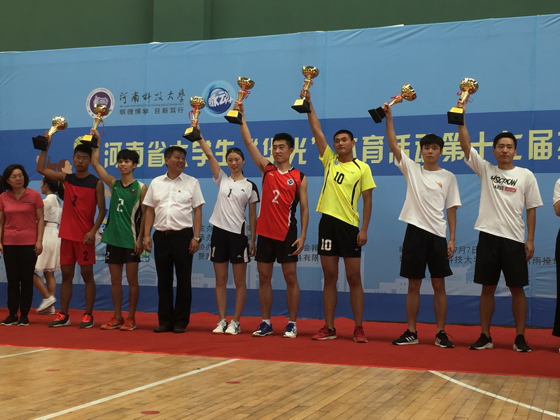 7月7日—13日,河南省大学生“华光”体育活动第十七届排球比赛在河南科技大学举行。本次比赛共有来自全省28所高校的44支队伍506名大学生运动员参赛。beat365在线平台官网学生女子排球队经过8场激烈角逐夺得问鼎机会,最终取得本科女子甲组亚军。副校长赵一鹏到冠亚军决赛现场为运动员鼓劲加油。