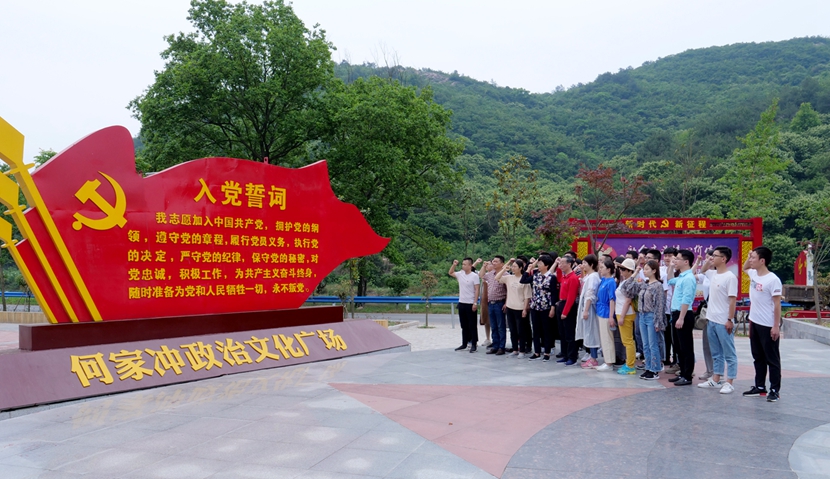 到达何家冲后,党总支书记张晓、院长高明海带领大家来到政治文化广场,面对鲜红的党旗,重温入党誓词。组织员吕一品老师领誓,全体党员举起右拳,句句千斤,字字如磐,铿锵有力的誓言在广场回响。
