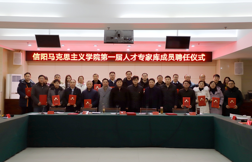 孙军介绍了“信阳马克思主义学院第一届人才专家库成员”的遴选标准及过程。邱兴平宣读了“信阳马克思主义学院第一届人才专家库成员”名单。随后,相关领导向专家库成员颁发聘认证书并合影留念。接着,孙军宣读了《信阳马克思主义学院专家人才库成员考核管理办法》。