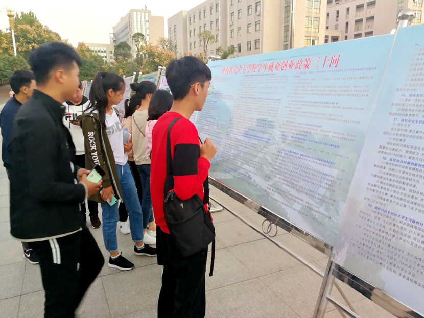 宣传周活动期间,招生就业处制作了《河南省大中专学校学生就业创业政策“三十问”》海报500份,在招生就业处就业服务大厅、教学楼、餐厅、侯车厅公示栏、宿舍、团总支学生会和学生社团活动场所张贴。招生就业处及各教学院部在学校汝宁广场设置了现场咨询服务台,并制作了国家就业创业政策、本单位就业创业工作特色、取得的成绩及良好做法等主题展板。学校在网站、微博、微信公众号发布《河南省大中专学校学生就业创业政策“三十问”》,并在学校广播站开设关于大学生就业创业政策解读专栏。招生就业处在“学校就业信息网”、“校内办公信息网”和招生就业处微信公众号发布各类政策文件。