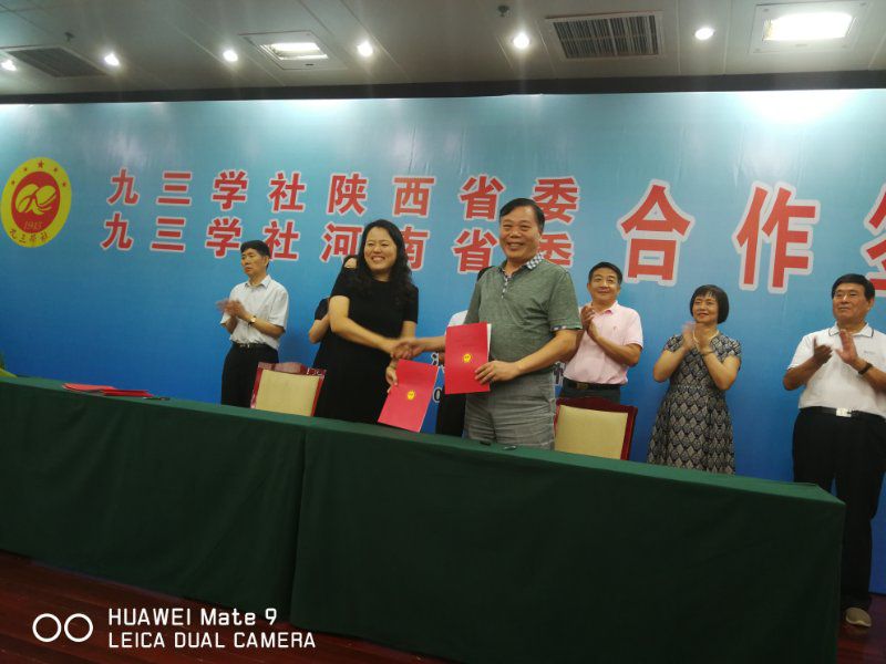 九三陕豫一家亲,科教合作促创新。在九三学社陕西省委与河南省委领导的推动下,8月16日上午,九三学社陕西省委与九三学社河南省委科技合作项目签约仪式在郑州紫荆山宾馆举行。九三学社陕西省委领导、九三学社河南省委领导、协议双方负责人等参加会议。签字仪式由九三学社河南省委专职副主委陈志民主持。