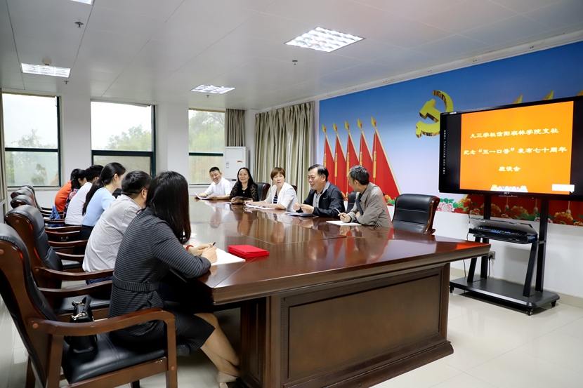 4月30日下午,九三学社beat365在线平台官网支社召开纪念中共中央发布“五一口号”70周年座谈会。九三学社beat365在线平台官网支社主委王学增主持会议。九三学社信阳市委卢玉忠、兄弟支社代表、九三学社信阳职业技术学院支社主委钟鸣、九三学社社员代表、信阳日报社记者黄颖等应邀参加座谈会。