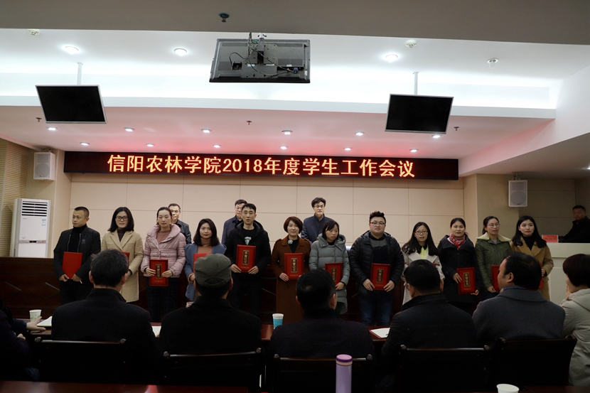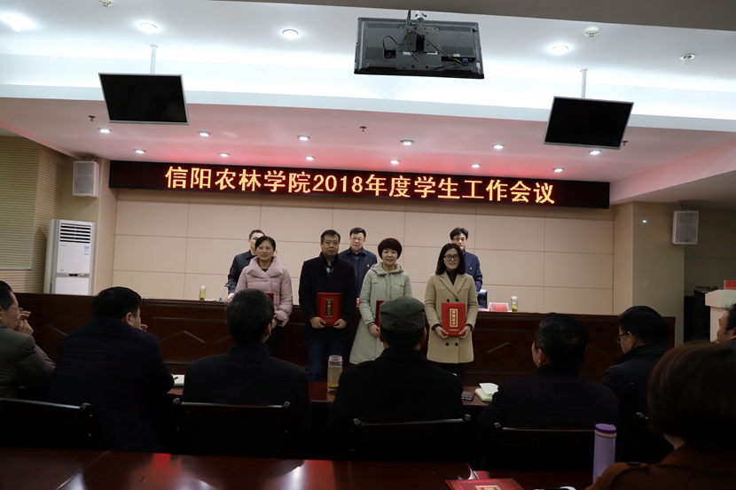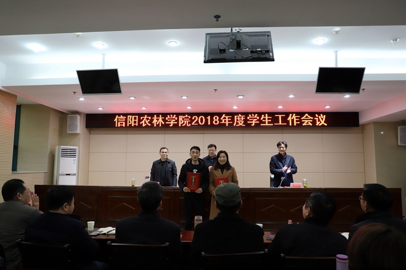 副校长赵一鹏宣读了2017年度学生工作目标考核优秀单位、2017年度学生资助工作优秀单位、2017年度优秀辅导员和2017-2018学年第一学期诚信考试班级的表彰决定。随后,刘光生、赵一鹏、王庆兵为先进集体和先进个人颁发了荣誉证书。林学院党总支书记赵师成、外语学院辅导员范琼琼分别代表先进集体、先进个人发言。