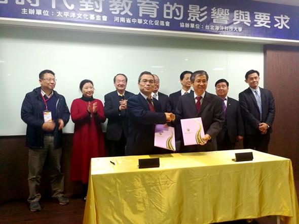 根据学校年度工作安排,2017年12月3日至9日,副校长王庆兵率领组织部部长陈廷国、人事处处长胡克福、教学质量监控与评估中心主任王学增、学生处处长何涛、实验设备管理处处长李明彦一行六人随河南省中华文化促进会赴台参加在台北海洋科技大学举办的“2017年两岸经济文化(新北)论坛”,对台北商业大学、台北海洋科技大学、朝阳科技大学、侨光科技大学、中原大学进行考察交流并与其中三所学校签署合作备忘录。河南大学前校长娄源功、河南省中华文化促进会副主席兼秘书长王武伟、台湾太平洋文化基金会董事长钱复、台湾太平洋文化基金会执行长刘瑞生、台北海洋科技大学校长唐彦博等嘉宾出席论坛。