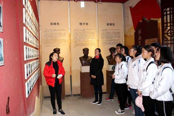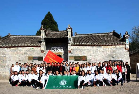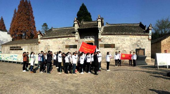 全体人员在思政部主任邱兴平、团委组织宣传部部长孙莉琴带领下,来到何家冲红二十五军军部旧址——何氏祠。首先,学生们在团旗下重温了入团誓词,旨在增强新时期团员意识,明确团员义务;接着举行了“追求远大理想 坚定崇高信念 喜迎十九大”征文颁奖活动,思政部主任邱兴平为获奖学生颁奖。之后,全体师生在讲解员的引领下参观了何氏祠,祠堂里陈列的照片、文件、红军遗物等各种珍贵历史资料,使同学们对何家冲的人文地理和革命历史有了直观详细的了解,尤其是革命先烈在形势严峻、环境艰苦、物资匮乏的情况下,仍然坚持与敌人进行勇敢斗争的革命精神使同学们倍受感动和鼓舞。最后,同学们在老师的带领下“重走长征路”,翻过陡峭险峻的大山,走过摇晃剧烈的铁索桥,来到一棵千年银杏树下,这里就是红二十五军长征出发集结地。千银杏树、石磨盘和红军井,一起见证了当年红军出发誓师的场景。