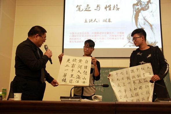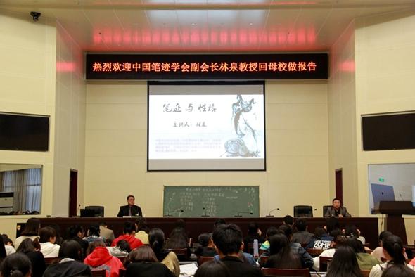 此次讲座由文学艺术教学部与外国语学院联合举办。林泉校友现为中国书法协会会员、中国笔迹学会副会长、河南省心理研究所笔迹研究发展中心主任、河南省轩辕书画院副院长、河南省古玩艺术品鉴定委员会副秘书长、《中原收藏报》主编、河南省拍卖行有限公司特聘鉴定专家、河南大学客座教授。(文学艺术教学部 彭孝义)