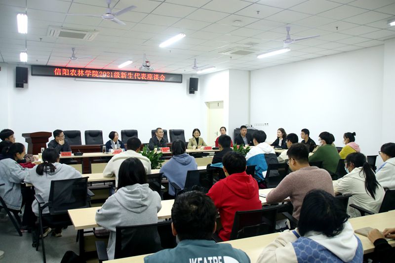 10月26日下午,beat365在线平台官网2021级新生代表座谈会在艺术中心202会议室举行。党委副书记王庆兵,副校长王万玲,党委学工部、武装部、学生处、大学生资助中心负责人和各专业新生代表参加会议。会议由学生处副处长魏宗烽主持。