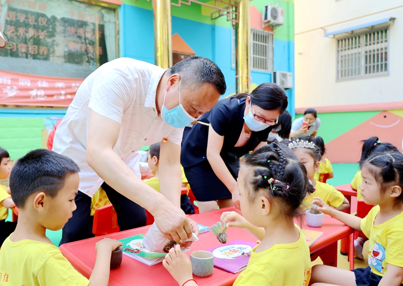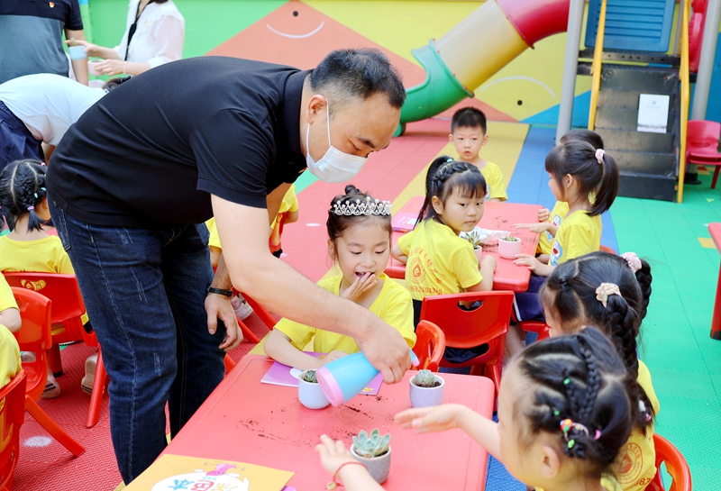 活动开始,团委党支部书记王鹏为小朋友们讲述了习近平总书记对少年儿童“祝小朋友们学习进步、快乐生活、茁壮成长!”的寄语,希望小朋友们从小坚定听党话跟党走的决心,早日成长为德智体美劳全面发展的社会主义建设者和接班人。孙羽佳和宋钰琪两位老师同小朋友们一起演唱了儿歌《娃哈哈》,并从歌声中引导小朋友们要讲文明、爱劳动,共同建设如花园般美丽的祖国,做维护生态文明的“小卫士”。参与活动的党员通过和小朋友们一起栽种多肉植物小盆栽,在小朋友们心中种下劳动之美、生态之美、生命之美的种子,让小朋友们形成热爱劳动、热爱大自然、尊重生命的美好情感。最后,党员们向小朋友们赠送了文具和绘本,并同小朋友们一起描绘多彩的图画。