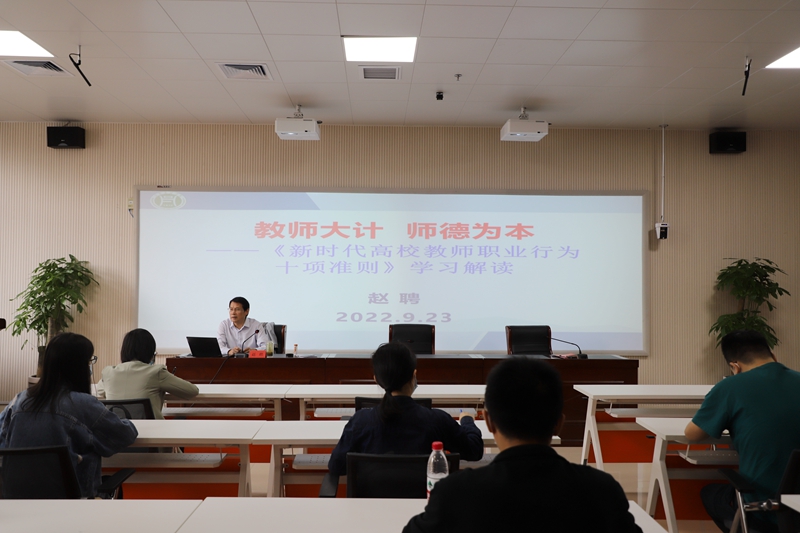 开班仪式结束后,赵聘为beat365在线平台官网2022年新入职教师讲授岗前培训第一课——“教师大计,师德为本”《新时代高校教师职业行为十项准则》解读,以典型案例、身边事例为切入点进行生动阐释,为新入职教师树立良好师德师风,坚持立德树人、做学生的引路人打下了坚实思想基础。
