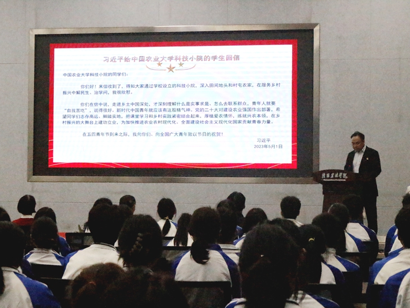 入团宣誓仪式开始前,与会师生一起学习了习近平总书记给中国农业大学科技小院的同学们的回信精神。与会师生表示,习近平总书记给中国农业大学科技小院的同学们的回信,凝聚着对新时代农业人才的希望与嘱托,为新型农业人才的成长指明了方向。作为农业院校的团员青年,要争当新时代乡村振兴的生力军和突击队,自觉把理想追求融入加快推进农业农村现代化、全面建设社会主义现代化国家火热实践之中。