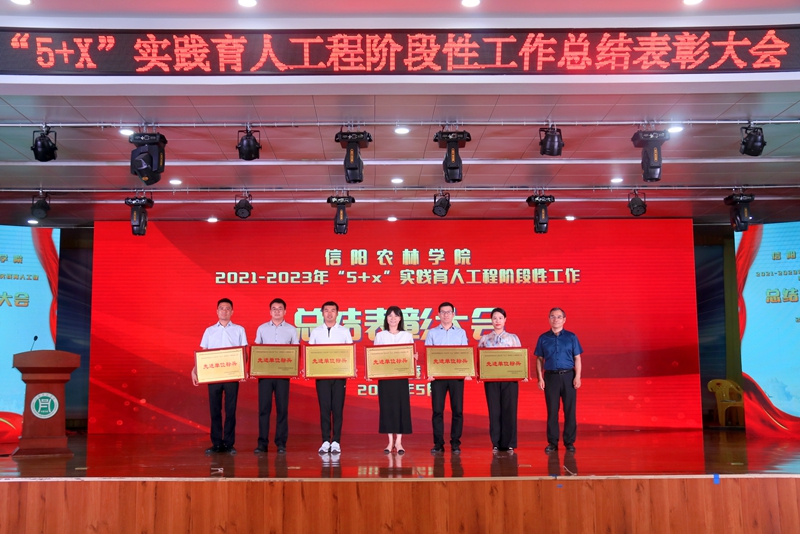 简频捷宣读了对2021-2023年“5+x”实践育人工程阶段性工作先进个人标兵、优秀朋辈导师、优秀指导教师标兵及工作先进单位标兵的表彰决定。与会领导分别为受表彰的单位和个人颁发了证书和奖牌。茶学院王斯璇同学、食品学院黄冰钰同学、财经学院荣翊贝老师及动物科技学院尹磊老师作为优秀典型代表作了发言。