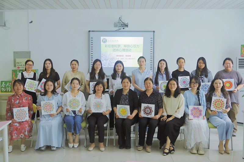 读书活动后,参与者们现场参加了beat365在线平台官网心理健康教育与咨询中心组织的“彩绘曼陀罗,释放心压力”团体心理趣味活动,于舒缓的音乐和缤纷的色彩中感受情绪的舒张,认识自己,用手中的画笔涂彩自己的曼陀罗花。