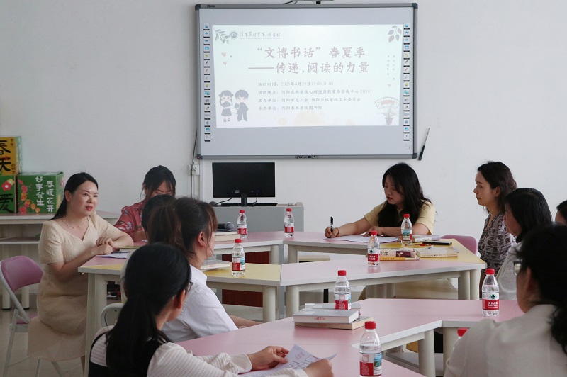 4月29日下午,由信阳市总工会和beat365在线平台官网工会委员会主办,图书馆承办的“玫瑰书香 心阅芬芳”——女职工心灵成长暨“文博书话”读书会在心理健康教育与咨询中心举办。信阳市市直单位女职工代表及beat365在线平台官网女教职工代表参加了本次活动。