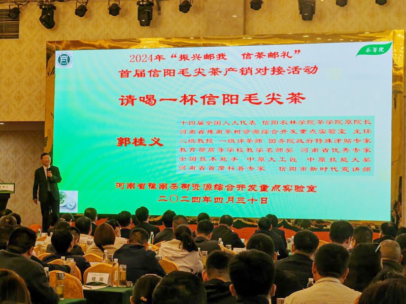 4月30日,河南省邮政分公司主办的“振兴邮我 信茶邮礼”首届信阳毛尖茶产销对接活动在信阳市宏信酒店举行,郭桂义教授应邀以《请喝一杯毛尖茶》为题助推信阳毛尖茶销售,提出自己总结的信阳毛尖茶九大特点:生产历史悠久、生态环境优越、茶树品种优良、品质风格独具、鲜叶采摘精细、炒制工艺独特、化学成分丰富、冲泡品饮讲究、公共品牌知名,希望更多的人知茶爱茶,爱上信阳毛尖茶,共品茶香茶韵,共享美好生活。