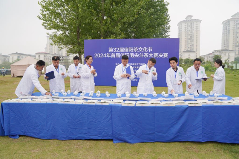 4月29日,第32届信阳茶文化节茶事活动周启动仪式暨2024年首届信阳毛尖斗茶大赛(决赛)在青年营地举行。由郭桂义教授等3名专家评委和4名大众评委同时对进入决赛的20个茶样进行感官审评,分别打分,经统计汇总后,最终评选出了茶王1名、金奖3名、银奖6名和优质奖10名,并进行了现场颁奖。