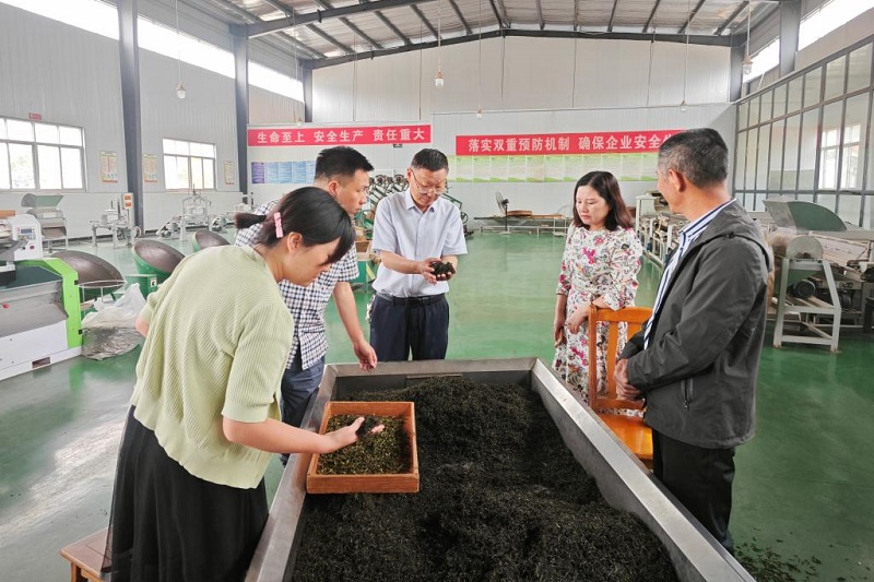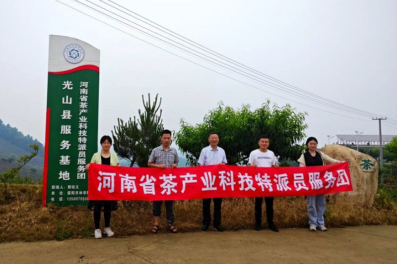 深入茶区现场指导企业提高夏秋茶低档资源利用。5月30日,团长郭桂义教授带领科技特派员陈义教授、罗金蕾博士、团队成员王晶晶老师前往光山县开展科技服务活动。服务团先后到四季香茶业、大尖山生态茶业种植基地和河南赛山悟道生态茶业有限公司,针对相关企业夏秋茶资源利用、茶园水肥管理、粗老原料制茶等问题开展调研指导。同时,由科技特派员牵头与赛山悟道公司签订了校企研发中心合作协议,推进茶产业产学研各环节相互贯通,科技助力企业发展,实现科技创新、人才与产业、企业精准对接,形成产学研深度融合的创新体系。