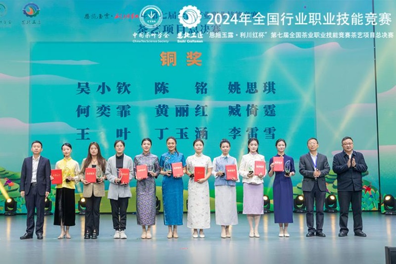 本场大赛由中国茶叶学会、中国就业培训技术指导中心、农业农村部人力资源开发中心共同主办,比赛严格参照最新国赛评判方法执行。茅盾文学奖获得者王旭烽教授担任裁判长,27省推荐的30位优秀裁判员、实习裁判员组成裁判委员会,第一、第二届全国技能大赛茶艺项目裁判长周智修研究员为专家委员会主任。经过前期分赛区的选拔推荐,来自全国27个省份的34名选手齐聚湖北恩施,同台竞技、以茶会友,开展了为期三天的激烈的角逐。选手们凭借娴熟的操作技能和出色的发挥,展示了高超的竞技水平,展现了我国新时代茶艺技能人才专业水准和精神面貌。在闭幕式上,郭桂义为获得铜奖的选手颁奖。