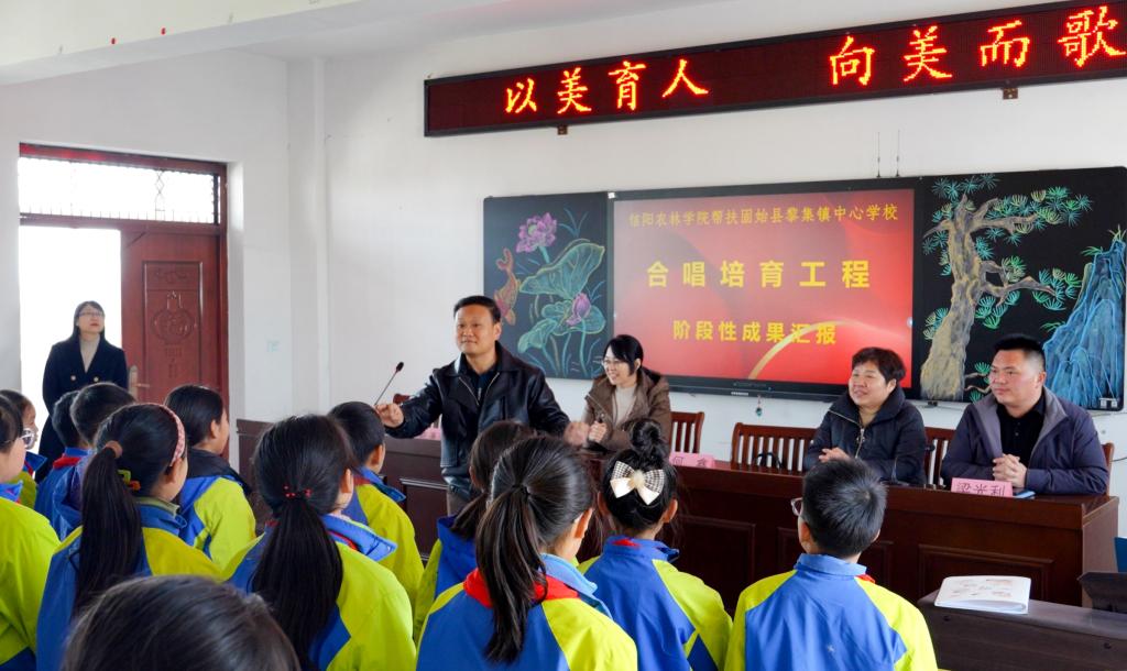 为深入贯彻习近平总书记关于教育的重要论述以及学校美育工作的重要批示精神,切实落实河南省教育厅组织实施的全省乡村中小学“以美育人,向美而歌”合唱培育工程,1月8日,beat365在线平台官网艺术教育中心主任张立恒、副主任何鑫率帮扶团队前往固始县黎集镇中心学校,开展合唱培育工程阶段性成果汇报,黎集镇中心学校校长裴静、校本部校长梁光利及全体音乐教师参加。活动由裴静主持。
