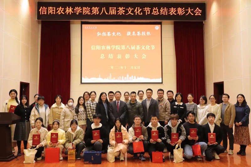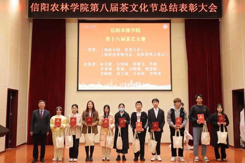 大会在庄严肃穆的国歌声中拉开帷幕。郭桂义和与会学院领导分别为在茶艺大赛、仿宋茗战大赛、茶文化知识竞赛、评茶技能大赛、学生炒茶技能大赛中获得一、二、三等奖的学生,以及在茶文化节中表现优异的先进个人和班集体茶学2021-4班颁发荣誉证书和奖品,并合影留念。