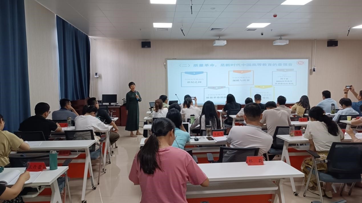 在报告中,司莉分享了自身从教二十余年的经历,引导大家思考“高校教师的明天会怎样”。她表示,供需矛盾是新时代中国高等教育的主要矛盾,质量革命是新时代中国高等教育的最强音。要解决好主要矛盾,需要教师回归潜心教书育人的本心。司莉还带领大家梳理了近十年来各类教育政策文件。通过对文件的解读和分析,让新入职教师形成了对于高等教育新时代的基本认识、关于新时代高校教师角色转型的基本认识和新时代高校课堂形态转变的基本认识。