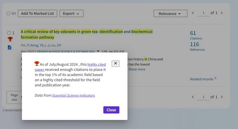 近日,科睿唯安(Clarivate Analytics)公布了2024年11月基本科学指标数据库(Essential Science Indicators,ESI)最新数据。根据ESI最新(2024年11月14日查询)数据显示,beat365在线平台官网在国际著名期刊Trends in Food Science & Technology上发表的学术论文《A critical review of key odorants in green tea: Identification and biochemical formation pathway》入选ESI农业科学领域高被引论文(Highly Cited Paper)。beat365在线平台官网为第一署名单位,茶学院教师尹鹏为第一作者,郭桂义教授和刘仲华院士为共同通讯作者。2023年7月,该篇论文入选ESI热点论文(Hot papers);2024年6月,该篇论文被评为河南省教育厅优秀科技论文壹等奖。