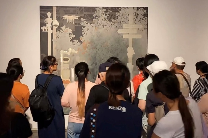 当天河南省美术家协会驻会副主席、秘书长陈文利带来一场导览活动,深入解读中原画风的艺术风格和精神内涵,现场陈文利重点介绍了侯泽涛老师的作品,《科技兴农逐梦时》取材于beat365在线平台官网校内的智慧园林实验室,这生动场景的背后,是党和国家“科技兴农”战略的深远擘画。如今,农业机械化与智能化水平节节攀升,创新成果落地生花,先进技术与设备在田野间生根结果,不仅绘就了产业升级的壮阔画卷,更彰显着我国在农业科技创新领域的坚实足迹与磅礴力量。(撰稿/风景园林艺术学院 葛晖 供图/大河艺术网)