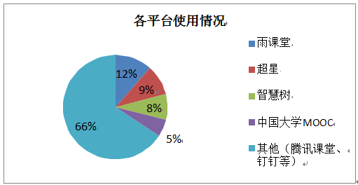 平台使用情况,使用超星平台授课共计170门次,中国大学MOOC课程共96门次,雨课堂课程共计210门次,智慧树平台课程共计145门次,学堂在线2门次,使用其他平台如腾讯课堂、腾讯会议、QQ直播、钉钉、视频录播等课程占比最大,共计1195门次。