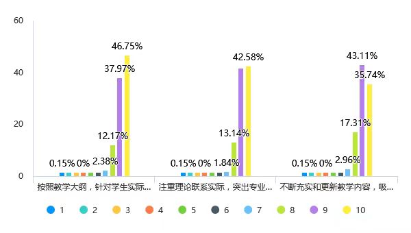 该维度平均分为9.19分(满分10分计),在“按照教学大纲,针对学生实际,科学地处理和利用教材;基本理论概念准确,重点突出,难点处理得当,内容详略得当。”“注重理论联系实际,突出专业实践与应用特色“注重理论联系实际,突出专业实践与应用特色”三个方面的满分率均未超过50%。