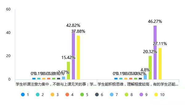 该维度平均分为9.02分(满分10分计),“学生听课注意力集中,不做与上课无关的事;学生有强烈的学习兴趣,课堂气氛活跃”的满分率为37.88%;“学生能积极思维,理解程度较高,有的学生还能提出自己不同的见解或问题”的满分率为27.11%。