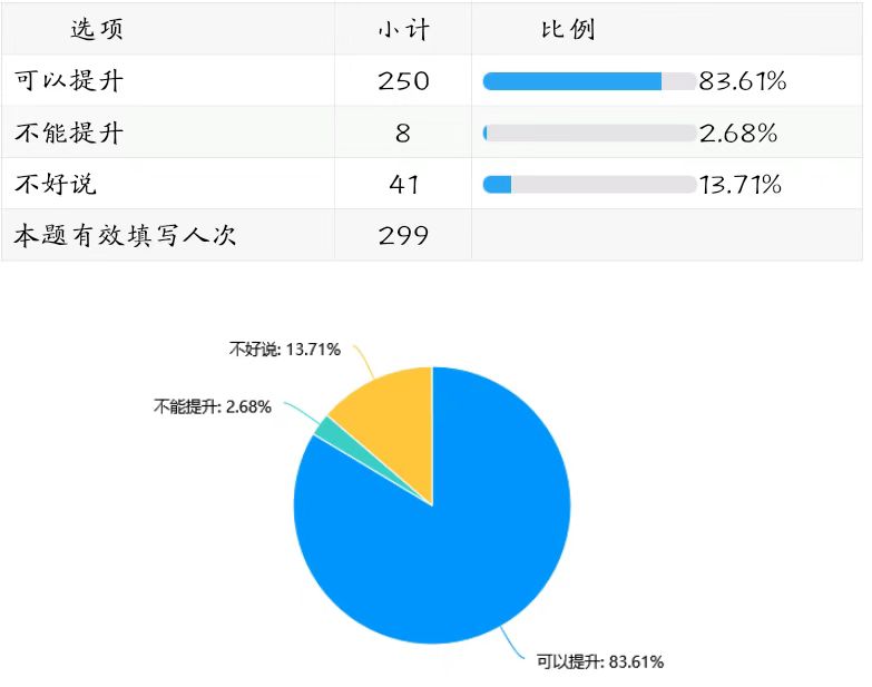 83.61%的受访者认同作为学校学生教学信息员可以提升自己的能力和素质,部分受访者13.71%持模糊观点。(详见下图表)