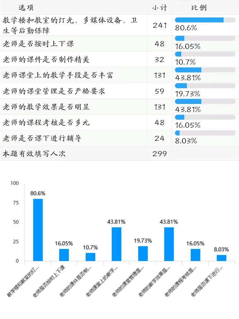 299名受访者的反馈来看,学生教学信息员最关注的三个方面依次是“教学楼和教室的灯光、多媒体设备、卫生等后勤保障”占比80.6%,“老师课堂上的教学手段是否丰富”“老师的教学效果是否明显”占比均为43.81%,同学们及关注教学后勤保障,也关注教学手段和教学效果。(详见下图表)