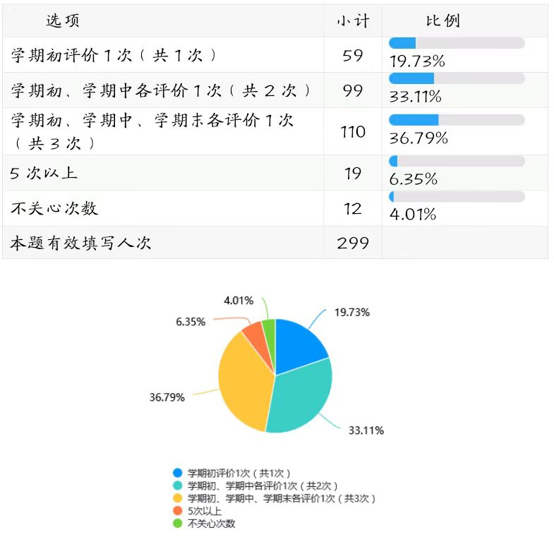 从反馈情况来看,在学生教学信息员的最低工作量确定上,学期初、学期中、学期末各评价1次(共3次)”是同学们认可度最高的取值范围(占比36.79%)。(详见下图表)