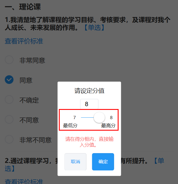 (7)填写评价表单,填写完成后点击【提交】即可提交表单。选定选项后,可以在设定分值处,滚动按钮,调整分值。