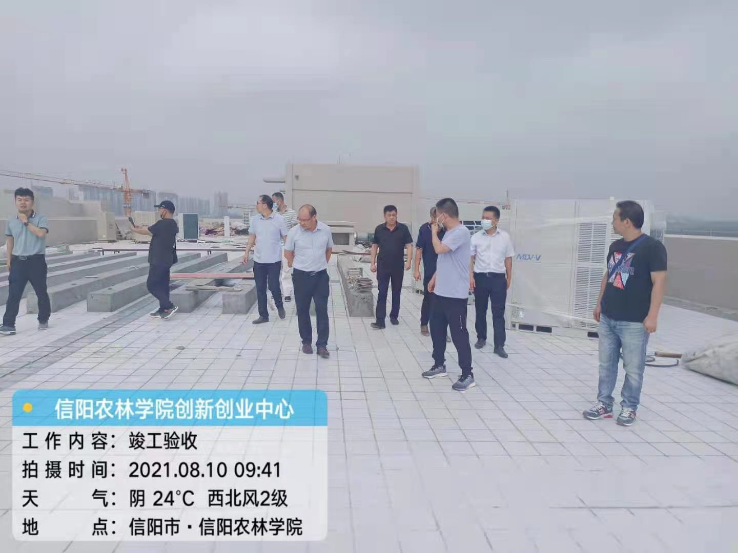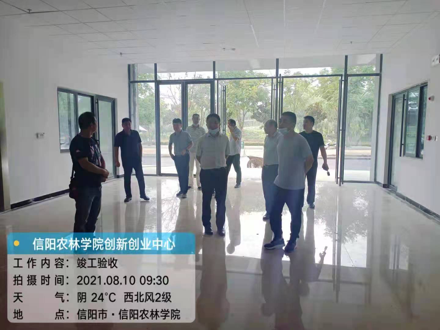 2021年8月10日上午,由基建处组织,信阳市质监站、各参建单位一起对创新创业工程进行了竣工验收,全面检查了该项目的建设情况,并在施工单位项目部会议室组织召开了竣工验收会。通过听取参建各单位的工程竣工验收汇报、现场实地查看和施工技术资料的查阅,大家一致认为该工程项目符合设计及合同文件的要求,同意通过竣工验收。